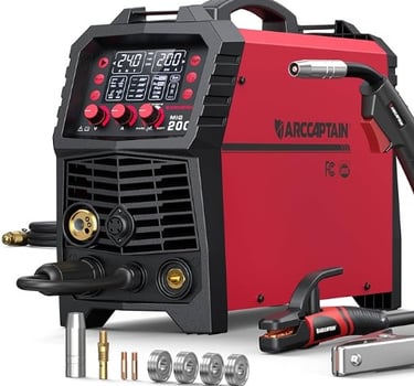 ARCCAPTAIN 200A 110V/220V 6-in-1 MIG welder with gas, flux core, TIG, stick, spot, spool gun.